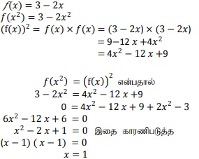 8. f என்ற சார்பு f(x) = 3 - 2x என வரையறுக்கப்படுகிறது. f (x2) = (f (x))2 எனில் x-ஐக் காண்க.