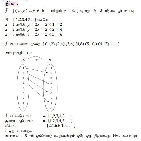 1. f = {(x,y) | x,y ∈ N and y = 2x} மற்றும் y = 2x} ஆனது N -ன் மீதான ஓர் உறவு என்க. மதிப்பகம், துணை மதிப்பகம் மற்றும் வீச்சகத்தைக் காண்க. இந்த உறவு சார்பாகுமா?