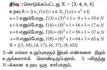 2. X = {3, 4, 6, 8} என்க. R = {(x, f (x)) | x ∈ X, f (x) = x2 + 1} என்ற உறவானது X-லிருந்து N-க்கு ஒரு சார்பாகுமா?