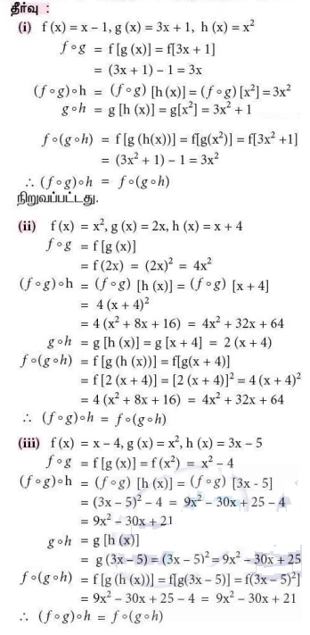8. கொடுக்கப்பட்ட f (x), g(x), h(x) ஆகியவற்றைக் கொண்டு (f o g) o h = f o (g o h) எனக் காட்டுக.