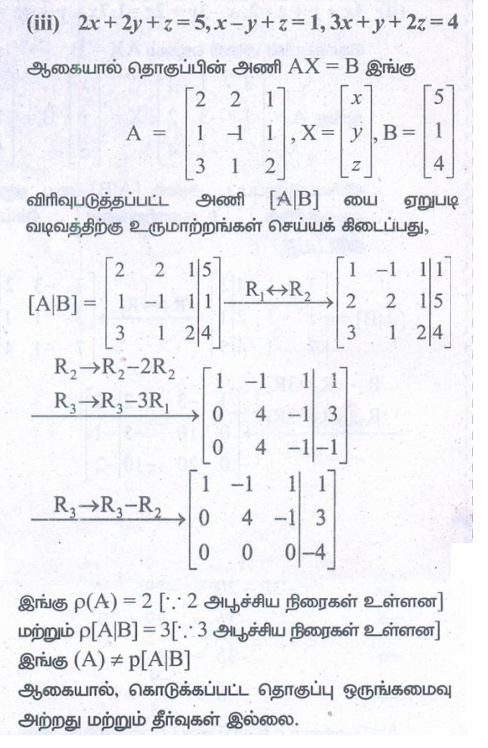12 ஆம் வகுப்பு கணிதம் : அத்தியாயம் 1 : அணிகள் மற்றும் அணிக்கோவைகளின் பயன்பாடுகள் : பயிற்சி 1.6: அசமப்படித்தான நேரியச் சமன்பாடுகள் (Non – homogeneous Linear Equation) : பல்வேறு வினாக்களுக்கான பதில்கள் மற்றும் தீர்வுகள்