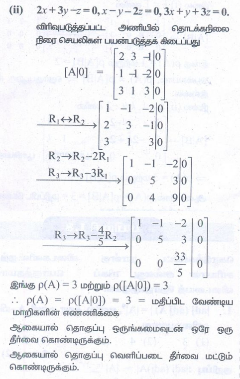 12 ஆம் வகுப்பு கணிதம் : அத்தியாயம் 1 : அணிகள் மற்றும் அணிக்கோவைகளின் பயன்பாடுகள் : பயிற்சி 1.7: சமபடித்தான நேரியச் சமன்பாடுகளின் தொகுப்பு (Homogeneous system of linear equations) - வரையறை, தேற்றம், நிரூபணம், எடுத்துக்காட்டு கணக்குகள் : 12 ஆம் வகுப்பு