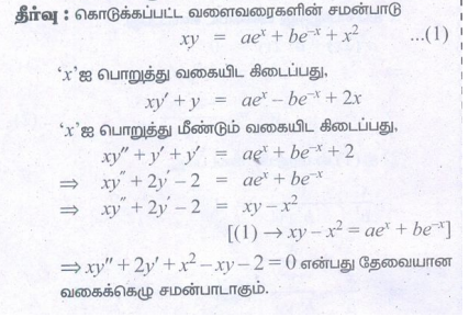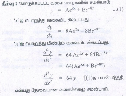 7. y = Ae8x + Be-8x எனும் சமன்பாட்டைக் கொண்ட வளைவரைக் குடும்பத்தின் வகைக்கெழுச்சமன்பாட்டைக் காண்க. இங்கு A, B என்பன ஏதேனும் இரு மாறிலிகள்.