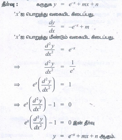 4. y = e-x + mx + n , என்பது ex(d2y/dx2) -1 = 0 எனும் வகைக்கெழுச் சமன்பாட்டின் தீர்வாகும்எனக்காட்டுக.