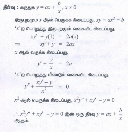 5. y = ax + b/x, x ≠ 0 என்பது x2 y" + xy' – y| = 0 எனும் வகைக்கெழுச் சமன்பாட்டின் தீர்வாகும்எனக்காட்டுக.
