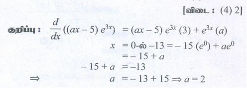 (10) x = 0 -ல், (ax - 5)ex -ன் வகைக்கெழு -13 எனில், 'a’-ன் மதிப்பு