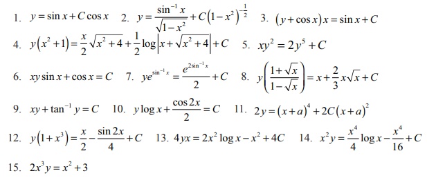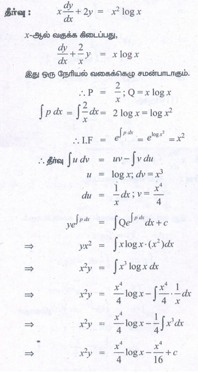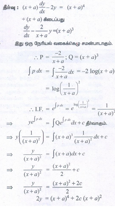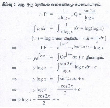 கணக்கு புத்தக பயிற்சி வினாக்கள் மற்றும் தீர்வுகள் - கணிதவியல் : சாதாரண வகைக்கெழுச் சமன்பாடுகள் : முதல் வரிசை நேரியல் வகைக்கெழுச் சமன்பாடுகள் (First Order Linear Differential Equations) : சோதனை வினாக்களுக்கான கேள்வி பதில், தீர்வுகள்
