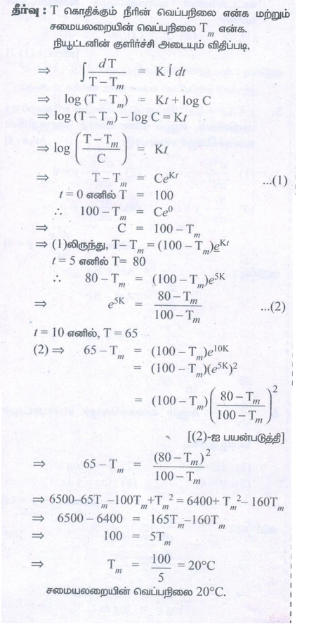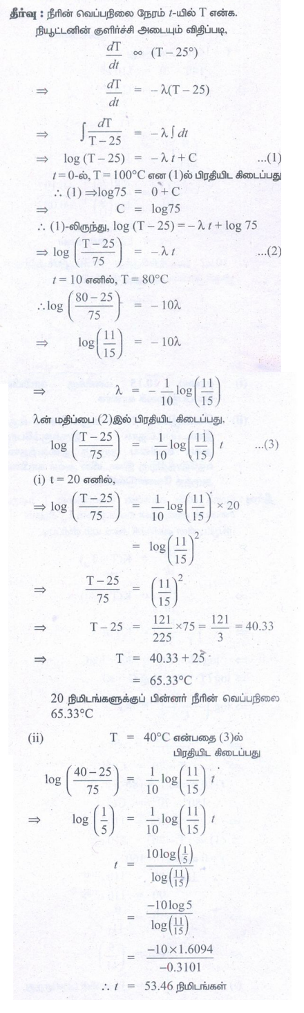 9. ஒரு பாத்திரத்தில் 100°C வெப்பநிலையில் கொதித்துக் கொண்டிருக்கும் நீரானது t = 0 எனும் நேரத்தில் அடுப்பின் மீது இருந்து இறக்கி குளிர்வதற்காக சமையலறையில் வைக்கப்படுகிறது. 5 நிமிடங்களுக்குப் பிறகு நீரின் வெப்பநிலை 80°C ஆகக் குறைகிறது. மேலும், அடுத்த 5 நிமிடங்களுக்குப் பிறகு நீரின் வெப்பநிலை 65°C ஆக குறைகிறது எனில், சமையலறையின் வெப்பநிலையைக் காண்க.