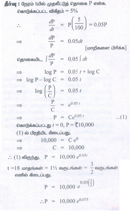 2. ஒரு நகரத்தின் மக்கள் தொகை வளர்ச்சி வீதம் t நேரத்தில் உள்ள மக்கள் தொகையின் விகிதமாக அமைந்துள்ளது. மேலும் நகரத்தின் மக்கள் தொகை 40 ஆண்டுகளில் 3,00,000லிருந்து 4,00,000 ஆக அதிகரித்துள்ளது எனக் கொடுக்கப்பட்டுள்ளது எனில், t நேரத்தில் அந்நகரத்தின் மக்கள் தொகையைக் காண்க.