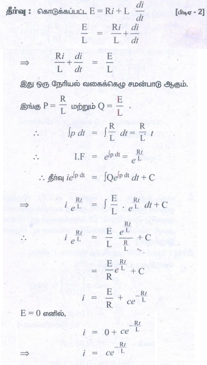 3. மின்தடை மற்றும் தன் மின் தூண்டல் கொண்ட ஒரு மின் சுற்றின் மின் இயக்கு விசையின் சமன்பாடு E = Ri + L (/di/dt) ஆகும். இங்கு E என்பது மின் சுற்றுக்கு கொடுக்கப்படும் மின் இயக்கு விசை, R என்பது மின்தடை மற்றும் L என்பது தன் மின் தூண்டல் எண் ஆகும். E = 0 எனும்போது t நேரத்தில், மின்சாரம் iஐக் காண்க.