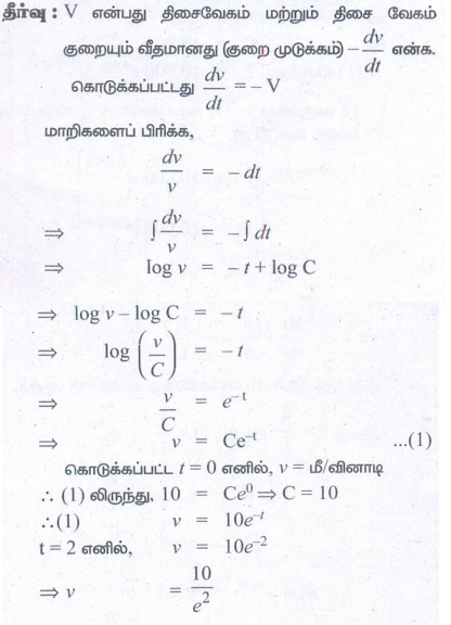 4. வினாடிக்கு 10 மீட்டர் வேகத்தில் இயங்கும் ஒரு மின்விசைப் படகின் இயந்திரம் நிறுத்தப்படுகிறது. அதன் பின்னர் ஏதேனும் ஒரு நேரத்தில் (இயந்திரம் நிறுத்தப்பட்ட பிறகு) மின் விசைப் படகின் வேகம் குறையும் வீதமானது அந்நேரத்தில் அதன் திசைவேகத்திற்கு சமமாக உள்ளது எனக் கொடுக்கப்பட்டுள்ளது. இயந்திரம் நிறுத்தப்பட்ட 2 வினாடிகளுக்குப் பிறகு விசைப்படகின் திசைவேகம் காண்க.