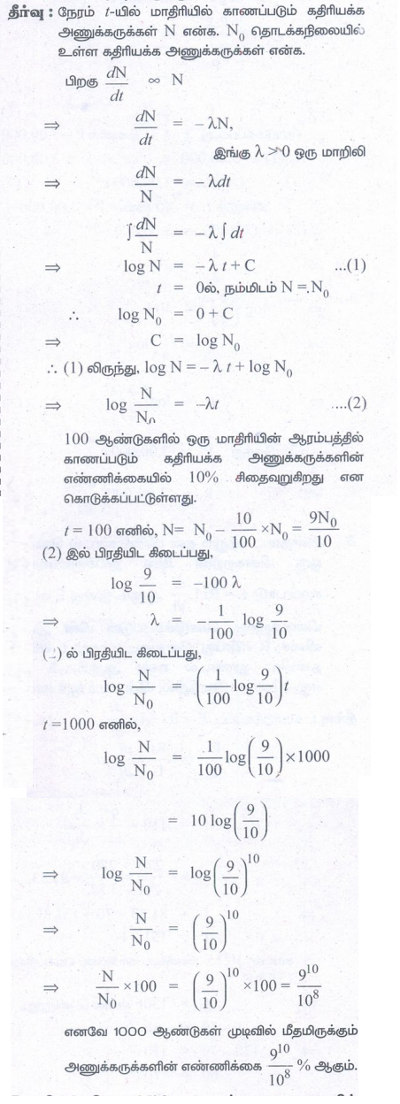 6. ஒரு மாதிரியில் காணப்படும் கதிரியக்க அணுக்கருக்கள் சிதைவுறும் வீதமானதுஅந்நேரத்தில் அந்த மாதிரியில் காணப்படும் அணுக்கருக்களின் எண்ணிக்கைக்கு விகிதமாக அமைந்துள்ளது. 100 ஆண்டு கால இடைவெளியில் ஒரு மாதிரியில் ஆரம்பத்தில் காணப்படும் கதிரியக்க அணுக்கருக்களின் எண்ணிக்கையில் 10% சிதைவுறுகிறது. 1000 ஆண்டுகள் முடிவில் ஆரம்பத்தில் காணப்படும் கதிரியக்க அணுக்கருக்களின் எண்ணிக்கையில் எவ்வளவு மீதமிருக்கும்?