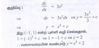 25. y = f(x) எனும் வளைவரையின் ஏதேனும் ஒரு புள்ளியிடத்து சாய்வு dy/dx = 3x2 எனக்கொடுக்கப்பட்டுள்ளது. மேலும் வளைவரையானது (-1,1) புள்ளி வழியாகச் செல்கிறது எனில், வளைவரையின் சமன்பாடு