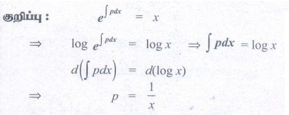 9. dy/dx + y = 1+y/x -என்ற வகைக்கெழுச் சமன்பாட்டின் தொகையீட்டுக் காரணி