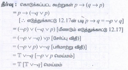 12. மெய்மை அட்டவணையைப் பயன்படுத்தாமல் p → ( q → p) என்பது ஒரு மெய்மம் அல்லதுஒரு முரண்பாடு எனச் சோதிக்க.