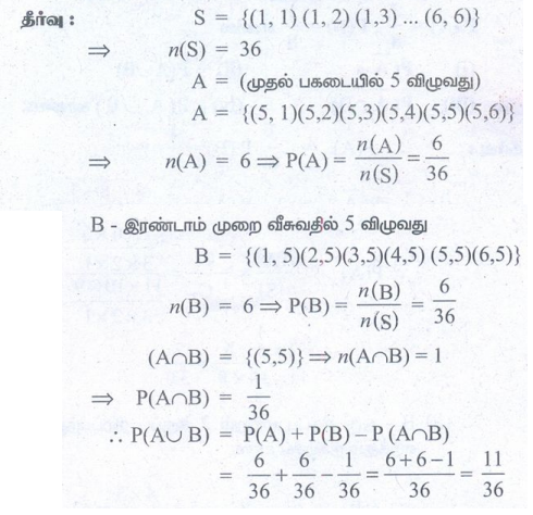 (3) ஒரு பகடை இருமுறை உருட்டப்படுகிறது. 'முதல் முறை வீசுவதில் 5 விழுவது’ நிகழ்ச்சி A எனவும் ‘இரண்டாவது முறை வீசுவதில் 5 விழுவது’ B எனக் கொண்டால் P(A∪ B) -ஐ காண்க.