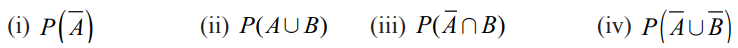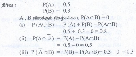 (4) A என்ற நிகழ்ச்சியின் நிகழ்தகவு 0.5, B என்ற நிகழ்ச்சியின் நிகழ்தகவு 0.3, மற்றும் A-யும் B-யும் ஒன்றையொன்று விலக்கும் நிகழ்ச்சி எனில் கீழ்க்காணும் நிகழ்தகவுகளைக் காண்க.