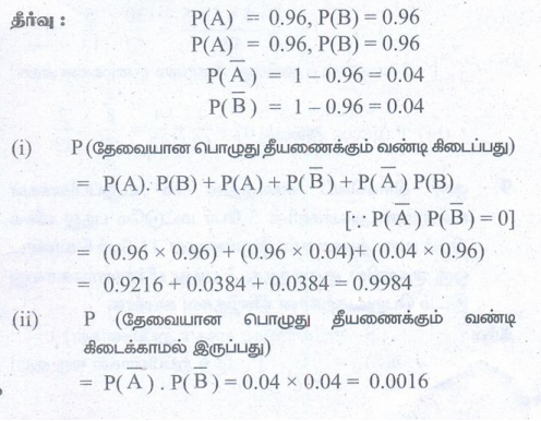 (5) ஒரு நகரத்தில் இரு தீயணைக்கும் வண்டிகள் தனித்தனியாகச் செயல்படும் வகையில் உள்ளன. ஒவ்வொரு தீயணைக்கும் வண்டி கிடைப்பதற்கான நிகழ்தகவு 0.96.