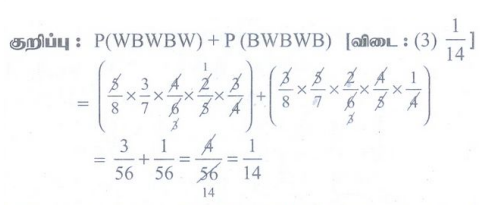 (10) ஒருபையில் 5 வெள்ளை மற்றும் 3 கருப்பு நிறப் பந்துகள் உள்ளன. பையிலிருந்து தொடர்ச்சியாக 5 பந்துகளை மீண்டும் வைக்கப்படாமல் எடுக்கும்போது பந்துக்களின் நிறம் மாறி மாறிக் கிடைப்பதற்கான நிகழ்தகவானது