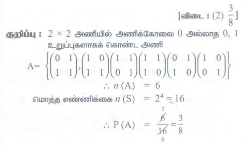 (9) வரிசை 2 உடைய அணிகள் கணத்தில் அணியின் உறுப்புகள் 0 அல்லது 1 மட்டுமே உள்ளது எனில் தேர்ந்தெடுக்கப்படும் அணியின் அணிக்கோவை மதிப்பு பூச்சியமற்றதாகக் கிடைப்பதற்கான நிகழ்தகவு