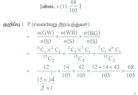 (7) ஒரு நபரின் கைப்பையில் 3 ஐம்பது ரூபாய் நோட்டுகளும், 4 நூறு ரூபாய் நோட்டுகளும் மற்றும் 6 ஐநூறு ரூபாய் நோட்டுகளும் உள்ளன. அவற்றிலிருந்து எடுக்கப்படும் இரு நோட்டுகளும் நூறு ரூபாய் நோட்டுகளாகக் கிடைப்பதற்கான நிகழ்தகவின் சாதக விகிதமானது.