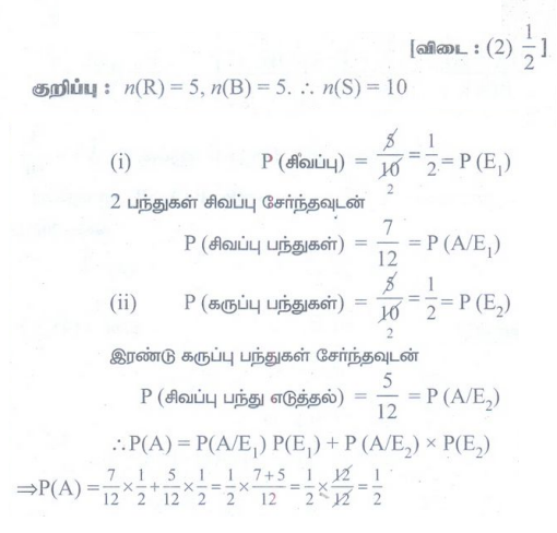 (14) ஒரு ஜாடியில் 5 சிவப்பு மற்றும் 5 கருப்பு நிற பந்துகள் உள்ளன. ஜாடியிலிருந்து சமவாய்ப்பு முறையில் ஒரு பந்து எடுக்கப்படுகிறது. அதனையும் அதன் நிறமுள்ள மேலும் இரு பந்துகளும் ஜாடியில் மீண்டும் வைக்கப்படுகின்றன. பின்னர் ஜாடியிலிருந்து ஒரு பந்து எடுக்கப்படும்போது அது சிவப்பு நிறப் பந்தாக இருப்பதற்கான நிகழ்தகவானது