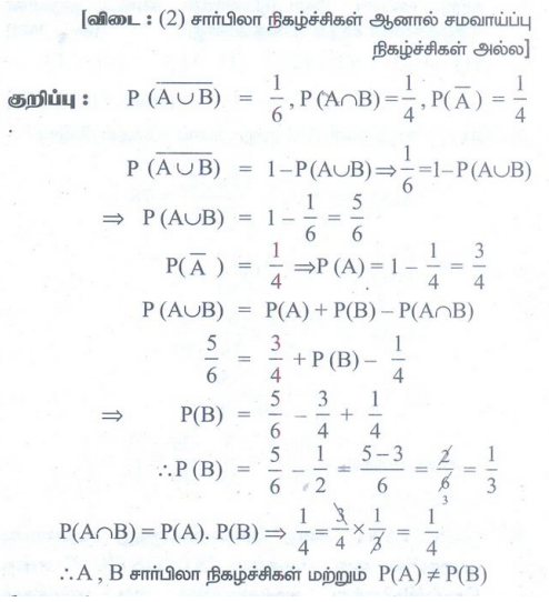 (24) A மற்றும் Bஎன்ற இரு நிகழ்ச்சிகள் நிகழ்வதற்கான நிகழ்தகவு முறையே 0.3 மற்றும் 0.6 ஆகும். A மற்றும் Bஒரே சமயத்தில் நிகழ்வதற்கான நிகழ்தகவு 0.18 எனில் A அல்லது Bநிகழாமல் இருப்பதற்கான நிகழ்தகவு