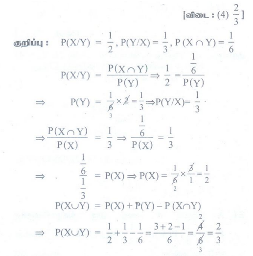 (13) X மற்றும் Y என்ற இரு நிகழ்ச்சிகளுக்கு P(X/Y) = 1/2, P(Y/X) = 1/3, P(X∩Y) = 1/6 எனில் P(X∪Y) -ன் மதிப்பு