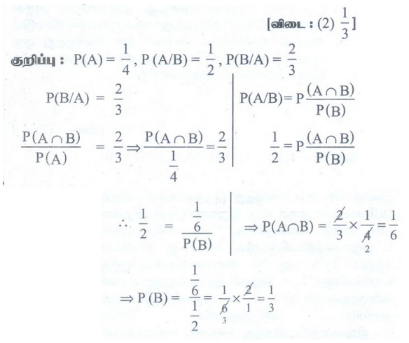 (21) A மற்றும் Bஎன்ற இரு நிகழ்ச்சிகளுக்கு P(A) = ¼, P(A|B) = 1/2 மற்றும் P(B/A) = 2/3 எனில் P(B)-ன் மதிப்பு