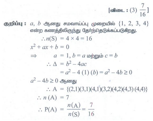 (20) a மற்றும் b-ன் மதிப்புகள் {1,2,3,4} என்ற கணத்தில் திரும்பத் திரும்ப வரும் என்ற வகையில் சமவாய்ப்பு முறையில் தேர்ந்தெடுக்கப்பட்டால் x2 + ax + b= 0 என்ற சமன்பாட்டின் மூலங்கள் மெய்யெண்களாக இருப்பதற்கான நிகழ்தகவு
