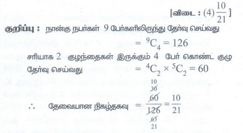(1) மூன்று ஆண்கள், இரு பெண்கள் மற்றும் நான்கு குழந்தைகள் உள்ள ஒரு குழுவிலிருந்து சமவாய்ப்பு முறையில் நான்கு நபர்கள் தேர்ந்தெடுக்கப்படுகின்றனர். அவர்களில் சரியாக இருவர் மட்டும் குழந்தைகளாக இருப்பதற்கான நிகழ்தகவு