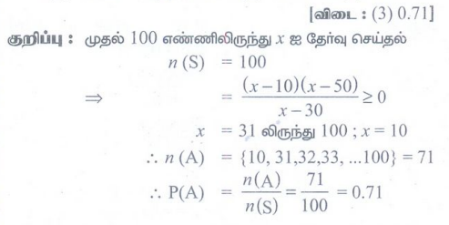 (15) ஒன்று முதல் நூறு வரையுள்ள இயல் எண்களிலிருந்து சமவாய்ப்பு முறையில் ஒரு எண் x தேர்ந்தெடுக்கப்படுகிறது. ((x-10) (x-50)) / x-30 ≥ 0 என்பதனைப் பூர்த்தி செய்யும் எண்ணைத் தேர்வு செய்யும் நிகழ்ச்சி A எனில், P(A) ஆனது