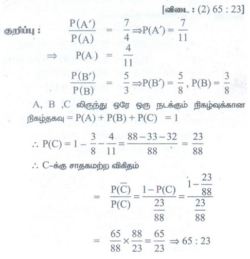 (19) A, B மற்றும் C என்ற மூன்று நிகழ்ச்சிகளில் ஒன்று மட்டுமே நிகழக்கூடும். A-க்கு சாதகமற்ற விகிதம் 7 -க்கு 4 மற்றும் B -க்கு சாதகமற்ற விகிதம் 5 -க்கு 3 எனில் C -க்குச் சாதகமற்ற விகிதம்