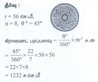 10. மையக் கோணம் 45° மற்றும் ஆரம் 56 செ.மீ உடைய 8 சம அளவுள்ள வட்டக்கோண வடிவ கிரானைட் கற்களைக் கொண்டு படத்தில் காட்டியுள்ளவாறு வட்டத்தை உருவாக்குகின்றனர் எனில், அவை ஒவ்வொன்றின் பரப்பளவைக் காண்க. (π = 22/7)