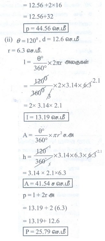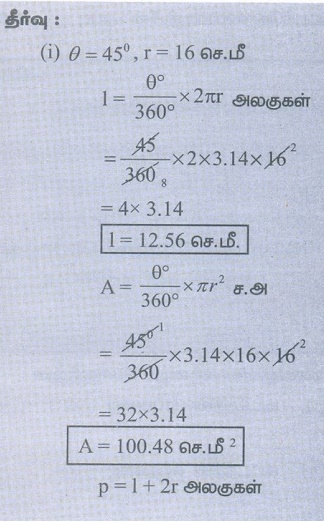 4. கீழே கொடுக்கப்பட்டுள்ள அளவுகளைக் கொண்ட வட்டக்கோணப் பகுதிகளின் வில்லின் நீளம், பரப்பளவு மற்றும் சுற்றளவு ஆகியவற்றைக் காண்க. (π = 3.14)