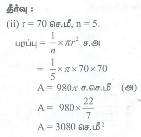 8. 70 செ.மீ. ஆரமுள்ள வட்டமானது 5 சம அளவுள்ள வட்டக்கோணப் பகுதிகளாகப் பிரிக்கப்படுகிறது. அவை ஒவ்வொன்றின் பரப்பளவைக் காண்க.