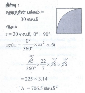 9. தாமு தனது வீட்டின் தரைப்பகுதியில் 30 செ.மீ பக்க அளவுள்ள சதுரவடிவ ஓட்டினைப்பதித்துள்ளார். அந்த ஓடானது படத்தில் உள்ளவாறு வடிவமைப்பைப் பெற்றுள்ளது எனில், அதிலுள்ள வட்டக்கோணப் பகுதியின் பரப்பளவைக் காண்க. (π = 3.14).
