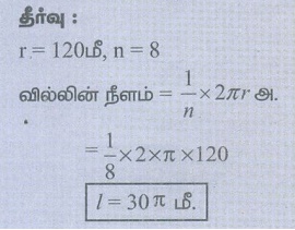 7. 120 மீ ஆரமுள்ள வட்டமானது 8 சம அளவுள்ள வட்டக்கோணப் பகுதிகளாகப் பிரிக்கப்படுகிறது. அவை ஒவ்வொன்றின் வில்லின் நீளத்தையும் காண்க.