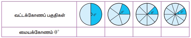 6. கீழே கொடுக்கப்பட்டுள்ள அளவுகளைக் கொண்ட வட்டக்கோணப் பகுதிகளின் மையக்கோணம் காண்க. (π = 22 / 7)
