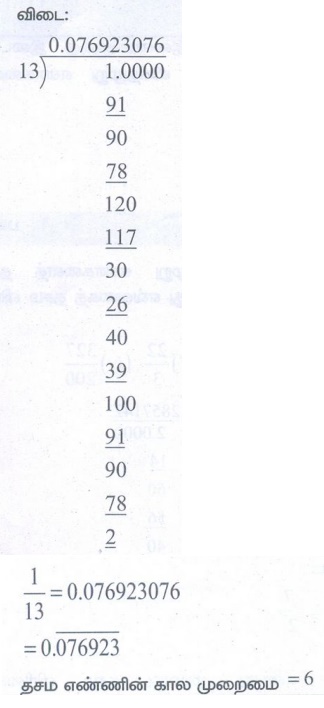 2. 1/13 ஐத் தசம வடிவில் எழுதுக. அதன் தசம எண்ணின் காலமுறைமையைக் காண்க?