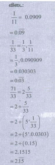 3. 1/11 இன் தசம விரிவைப் பயன்படுத்தி 1/33 இன் சுழல் தசம விரிவைக் காண்க. இதிலிருந்து 71/33 தசம விரிவைத் தருவிக்க.