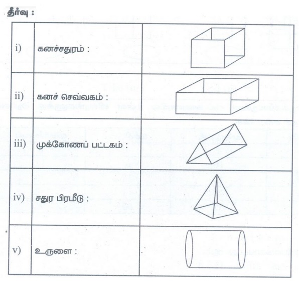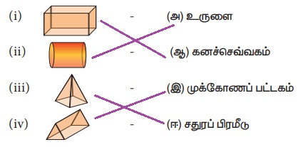 விடை: (i): (ஆ) கனச்செவ்வகம், (ii): (அ) உருளை, (iii): (ஈ) சதுரப் பிரமீடு, (iv): (ஈ) சதுரப் பிரமீடு