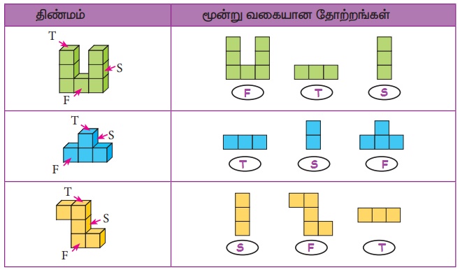 4. ஒவ்வொரு திண்மத்திற்கும் மூன்று தோற்றங்கள் கொடுக்கப்பட்டுள்ளன. அவை ஒவ்வொன்றிற்கும் தொடர்புடைய மேற்பக்க (T), முகப்பு (F) மற்றும் பக்கவாட்டுத் (S) தோற்றங்களை (T, F மற்றும் S) அடையாளம் காண்க.