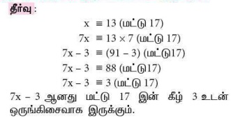 2. x ஆனது மட்டு 17 -யின் கீழ் 13 உடன் ஒருங்கிசைவாக உள்ளது எனில், 7x - 3 ஆனது எந்த எண்ணுடன் ஒருங்கிசைவாக இருக்கும்?