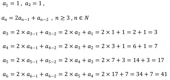 6. a1 = 1, a2 = 1 மற்றும் an = 2 an−1 +an −2, n ≥ 3, n ∈ N எனில், தொடர்வரிசையின் முதல் ஆறு உறுப்புகளைக் காண்க.