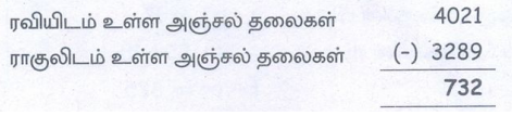 2. ராகுலிடம் 3289 அஞ்சல்தலைகள் உள்ளன. ரவியிடம் 4021 அஞ்சல் தலைகள் உள்ளன. ராகுலைவிட ரவியிடம் எவ்வளவு அஞ்சல் தலைகள் அதிகமாக உள்ளன?