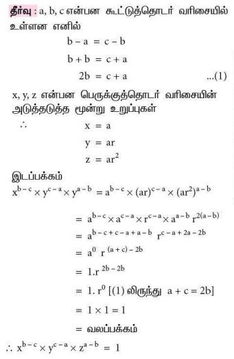 12. a, b, c என்பன ஒரு கூட்டுத் தொடர்வரிசையில் உள்ள மூன்று அடுத்தடுத்த உறுப்புகள் மற்றும் x, y, z என்பன ஒரு பெருக்கு தொடர்வசையின் மூன்று அடுத்தடுத்த உறுப்புகள் எனில் xb −c × yc −a × za −b = 1. என நிறுவுக.