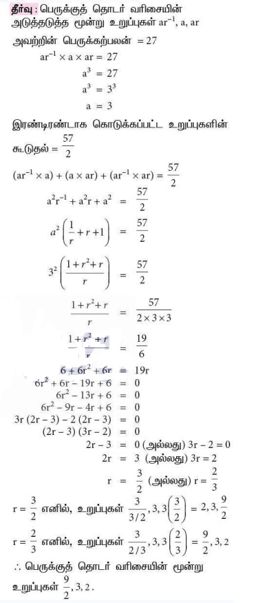 9. ஒரு பெருக்குத் தொடர்வரிசையில் அடுத்தடுத்த மூன்று உறுப்புகளின் பெருக்கற்பலன் 27 மற்றும் அவைகளில் இரண்டிரண்டு உறுப்புகளின் பெருக்கற்பலனின் கூடுதல் 57/2 எனில், அந்த மூன்று உறுப்புகளைக் காண்க.
