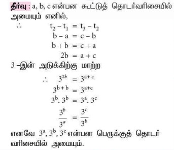8. a, b, c என்பன ஒரு கூட்டுத் தொடர்வரிசையில் அமையும் எனில் 3a, 3b, 3c ஒரு பெருக்குத் தொடர்வரிசையில் அமையும் எனக் காட்டுக.