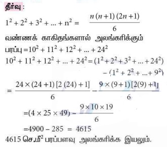 6. ரேகாவிடம் 10 செ.மீ, 11 செ.மீ, 12 செ.மீ, ...... 24 செ.மீ என்ற பக்க அளவுள்ள 15 சதுர வடிவ வண்ணக் காகிதங்கள் உள்ளன. இந்த வண்ணக் காகிதங்களைக் கொண்டு எவ்வளவு பரப்பை அடைத்து அலங்கரிக்க முடியும்?